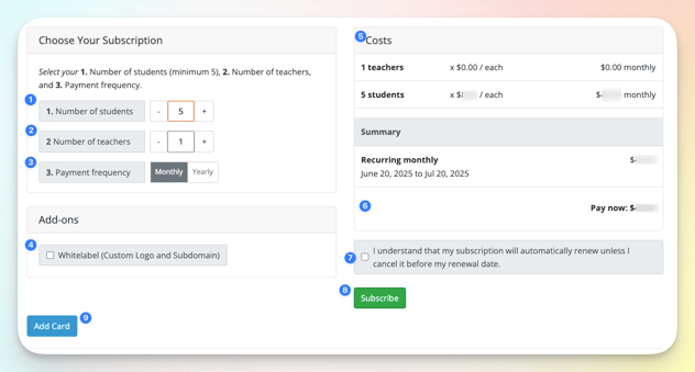 - Number of students: Enter the updated, total number of students. Subscriptions are available for 5 or more students.
