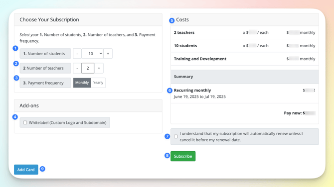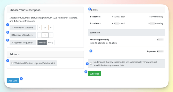 - Number of students: Subscriptions start at five students. You do not need to have five students to subscribe you will simply have access to up to five students to start.