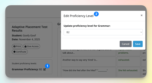 Teachers can now edit the proficiency level of a completed Adaptive Placement Test assessment.