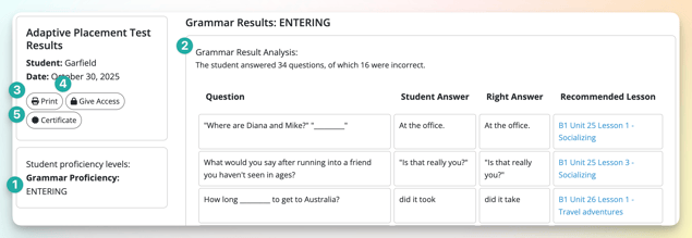 - Review the proficiency level: Review the student’s level to help determine which lessons to teach next. We recommend using our Step-by-Step Curriculum after the test.
