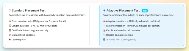 The Adaptive Placement Test is currently in beta. The feature is only available to select beta participants who have been invited. You can request access here.