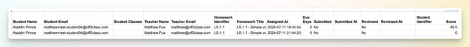 An email will be sent to you with a link to download the .CSV file. The email is usually sent after a few seconds and will come from app@off2class.com. The file contains the following information: