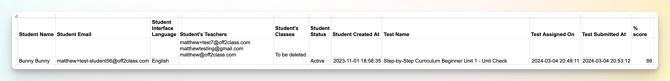 An email will be sent to you with a link to download the .CSV file. The email is usually sent after a few seconds and will come from app@off2class.com. The file contains the following information: