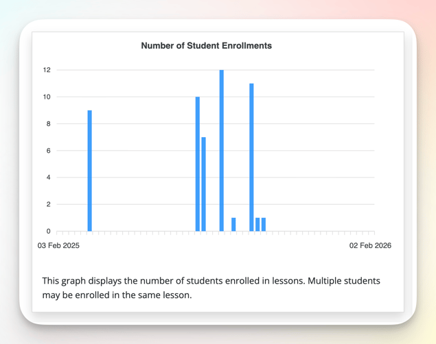This graph displays the number of students enrolled in lessons. Multiple students may be enrolled in the same lesson.