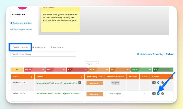Assign Homework from a student's profile after teaching a lesson