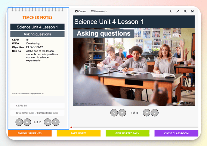 - Teacher Notes: Slide-by-slide resources that accompany Off2Class lessons with objectives, teaching tips, grammar explanations, exercise answers, and the lesson level (based on standards like WIDA or CEFR) to help teachers deliver lessons with minimal prep.