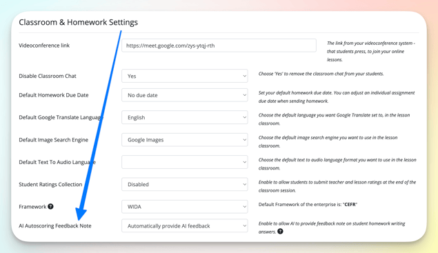 Locate the 'AI Autoscoring Feedback Note' setting, click on the menu, select your desired setting, then click 'Save Settings' on the bottom left