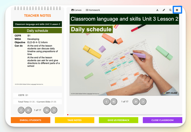 To hide teacher notes, click on the double arrows in the top right corner of the classroom