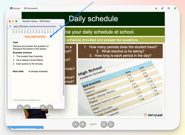 Teacher Notes cannot be printed. Instead, you open them on a separate device, such as your phone or tablet, to follow along in real time. This allows you to keep your notes visible only to yourself while sharing slides with your student — whether you’re teaching from a single device, projecting for a class, or screen sharing via video conferencing.